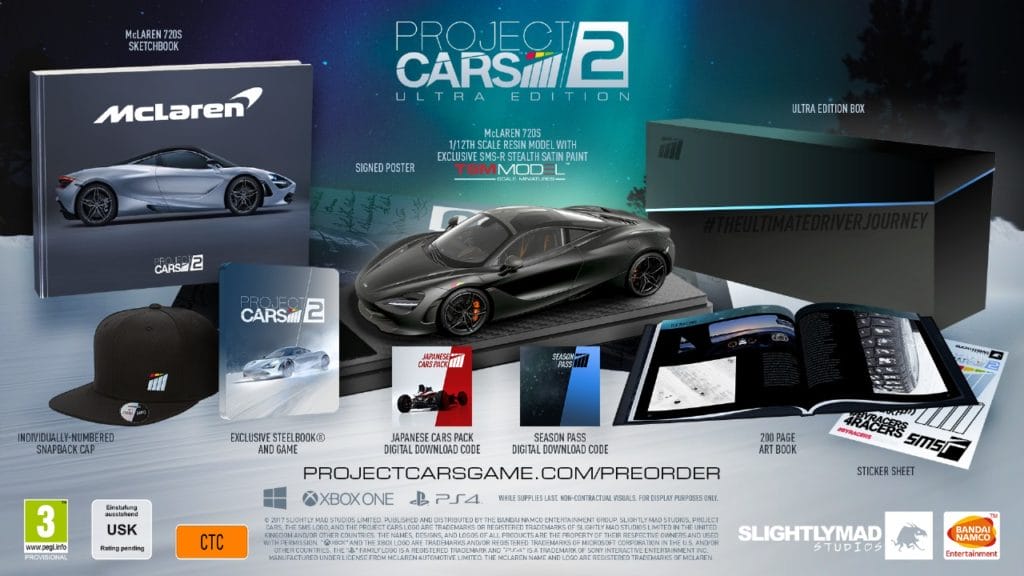 ULTRA EDITION: è l’edizione di Project CARS più esclusiva di sempre e un must have assoluto per tutti gli amanti di Project CARS 2. Disponibile in 1.000 copie nel mondo, include tutti i contenuti della Collector’s Edition, ad eccezione del modellino in scala 1/43 della mitica McLaren 720S sostituito da un modellino in scala 1/12 della Resin McLaren 720S (con livrea SMS-R Stealth Satin). L’ Ultra Edition include anche un poster firmato, un cappellino SnapBack numerato e un McLaren Sketchbook realizzato in collaborazione con McLaren e dedicato allo sviluppo della 720S (l’erede della 650S che ha lanciato la seconda generazione della Super Car McLaren).”